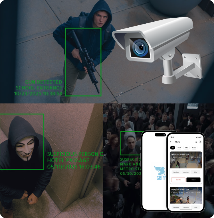 GRIFFIN365 is an AI-powered security intelligence platform that transforms traditional camera systems into proactive, real-time command centers. Operating 24/7, it leverages advanced Computer Vision, Deep Learning, and Intelligent Alert Orchestration to autonomously detect weapons, recognize suspects, identify identity concealment, and correlate multi-threat scenarios with enterprise-grade accuracy. Powered by multi-stage neural networks and vector-based facial recognition, GRIFFIN365 delivers context-aware threat assessment, intelligent duplicate filtering, and automated alert correlation. This AI-driven system enhances threat response, reduces operational overhead, and converts every frame into actionable intelligence prioritizing high-risk detections, generating qualified alerts across multiple channels, and mapping complex threat patterns seamlessly.